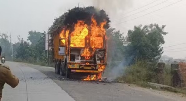 हाईवे पर गन्ने से लदे ट्रक में लगी अचानक भीषण आग, खाना बनाने के दौरान हुआ हादसा
